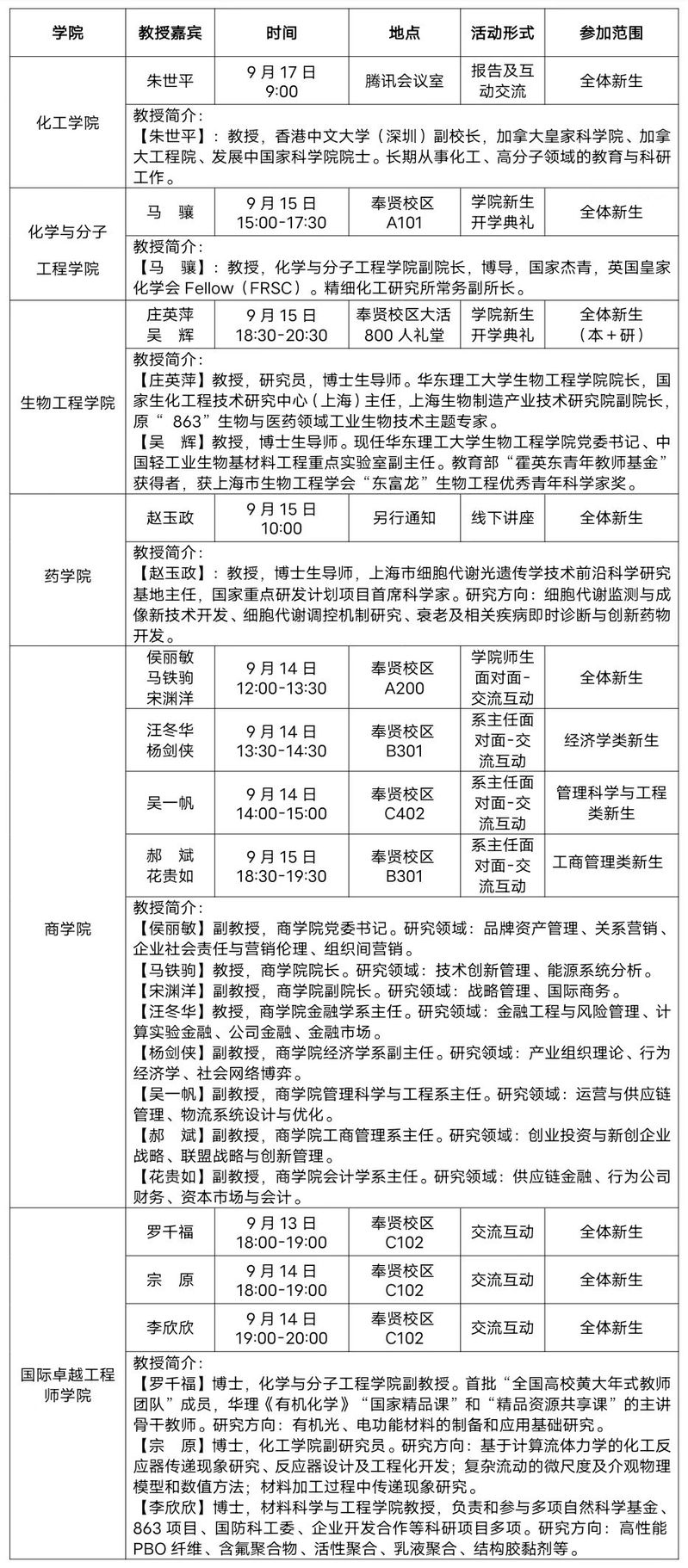 2022级新生入学教育“教授与新生面对面”活动安排表(第3周)