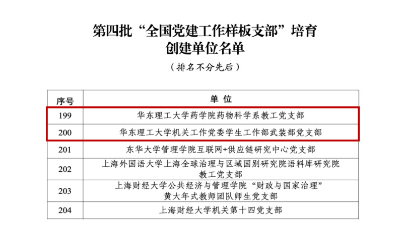 近日,教育部公布了第四批新时代高校党建示范创建和质量创优(以下简称“双创”)工作遴选结果,我校药学院药物科学系教工党支部和机关工作党委学生工作部武装部党支部入选“全国党建工作样板支部”培育创建单位名单。