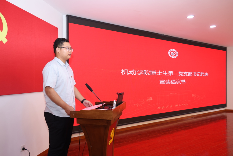 图片说明:机动学院博士生第二党支部书记聂文睿宣读倡议书