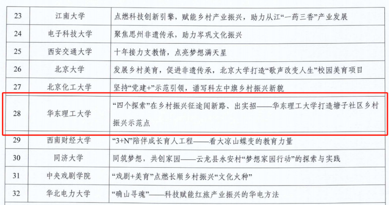 近日,第八届教育部直属高校精准帮扶典型项目推选结果公布,我校申报的“‘四个探索’在乡村振兴征途闯新路、出实招——华东理工大学打造塘子社区乡村振兴示范点”获评精准帮扶典型项目。这是学校继2021年获评教育部首批服务乡村振兴创新试验项目后,在精准帮扶项目领域取得的新突破。