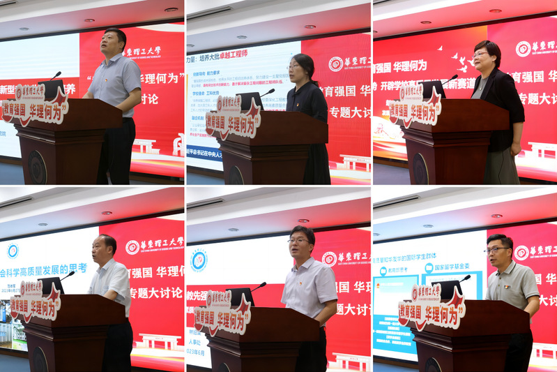 在“教育强国 华理何为”专题大讨论中,科学技术发展研究院院长赵黎明,研究生院院长、卓越工程师学院常务副院长杜文莉,发展规划处处长赵玲,人文社会科学处处长范体军,人事处处长林绍梁,国际教育学院院长李霄鹏,分别围绕“以特色化有组织科研支撑创新型专业化人才培养”“党建引领 协同一体 培养创新型卓越工程人才探索”“发挥学科特色优势,开辟学校高质量发展新赛道”“关于学校哲学社会科学高质量发展的思考”“强教先强师——加速建设高素质专业化创新型教师队伍”“教育强国 华理何为——来华留学高质量内涵式发展规划”等主题,作了交流发言。大家表示,要坚持不懈用习近平新时代中国特色社会主义思想凝心铸魂,始终将广大师生的需求和利益作为一切工作的出发点和落脚点,主动超前布局、有力应对变局、奋力开拓新局,以实际行动书写好“强国建设,教育何为”“教育强国,华理何为”的生动答卷。