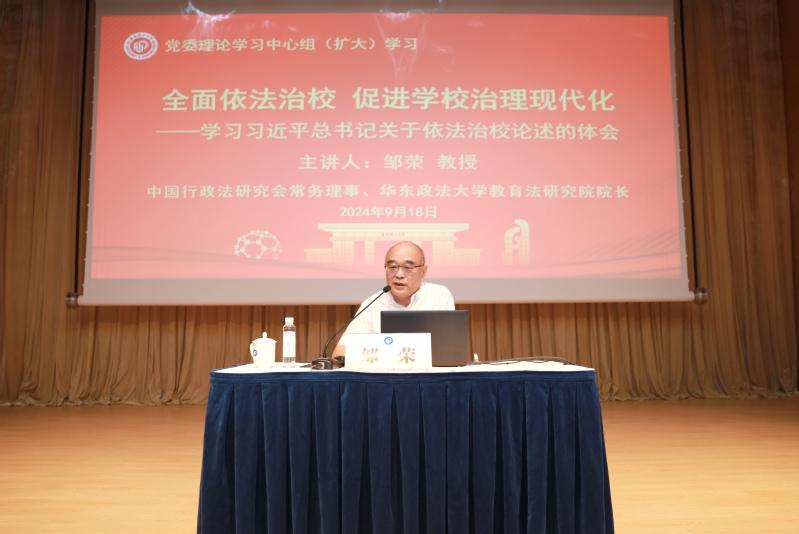 在学校党委理论学习中心组(扩大)学习会上,专题学习了习近平法治思想,邀请了中国行政法研究会常务理事、华东政法大学教育法研究院院长邹荣教授作题为“全面依法治校 促进学校治理现代化——学习习近平总书记关于依法治校论述的体会”的辅导报告。报告聚焦习近平法治思想的精神实质和核心要义,围绕习近平总书记关于依法治校的重要论述、依法治校的基本要求、依法治校的主要环节等三个方面进行了深入阐述,并着重介绍了依法治校的重点环节在于依法管理学生事务、依法管理学位事务、依法管理教师事务、依法维护学校权益。